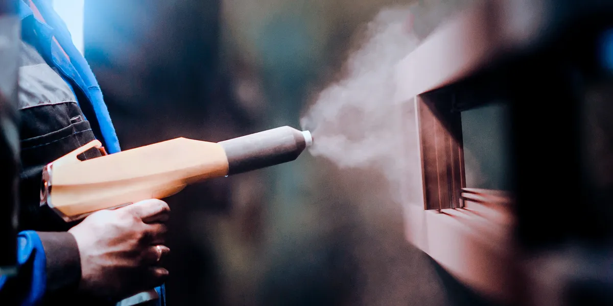Powder coating uses static electricity—the same stuff that makes a balloon stick to your hair, to stick to metal parts.